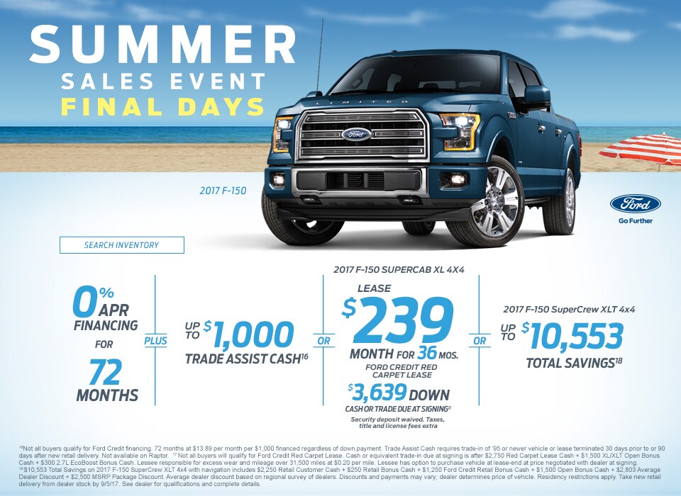 16Not all buyers qualify for Ford Credit financing. 72 months at $13.89 per month per $1,000 financed regardless of down payment. Trade Assist Cash requires trade-in of '95 or newer vehicle or lease terminated 30 days prior to or 90 days after new retail delivery. Not available on Raptor. 17 Not all buyers will qualify for Ford Credit Red Carpet Lease. Cash or equivalent trade-in due at signing is after $2,750 Red Carpet Lease Cash + $1,500 XL/XLT Open Bonus Cash + $300 2.7L EcoBoost Bonus Cash. Lessee responsible for excess wear and mileage over 31,500 miles at $0.20 per mile. Lessee has option to purchase vehicle at lease-end at price negotiated with dealer at signing. 18 $10,553 Total Savings on 2017 F-150 SuperCrew XLT 4x4 with navigation includes $2,250 Retail Customer Cash + $250 Retail Bonus Cash + $1,250 Ford Credit Retail Bonus Cash + $1,500 Open Bonus Cash + $2,803 Average Dealer Discount + $2,500 MSRP Package Discount. Average dealer discount based on regional survey of dealers. Discounts and payments may vary; dealer determines price of vehicle. Residency restrictions apply. Take new retail delivery from dealer stock by 9/5/17. See dealer for qualifications and complete details.